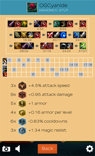 -builds are fully detailed : spells order, items order, masteries and runes page used during the game